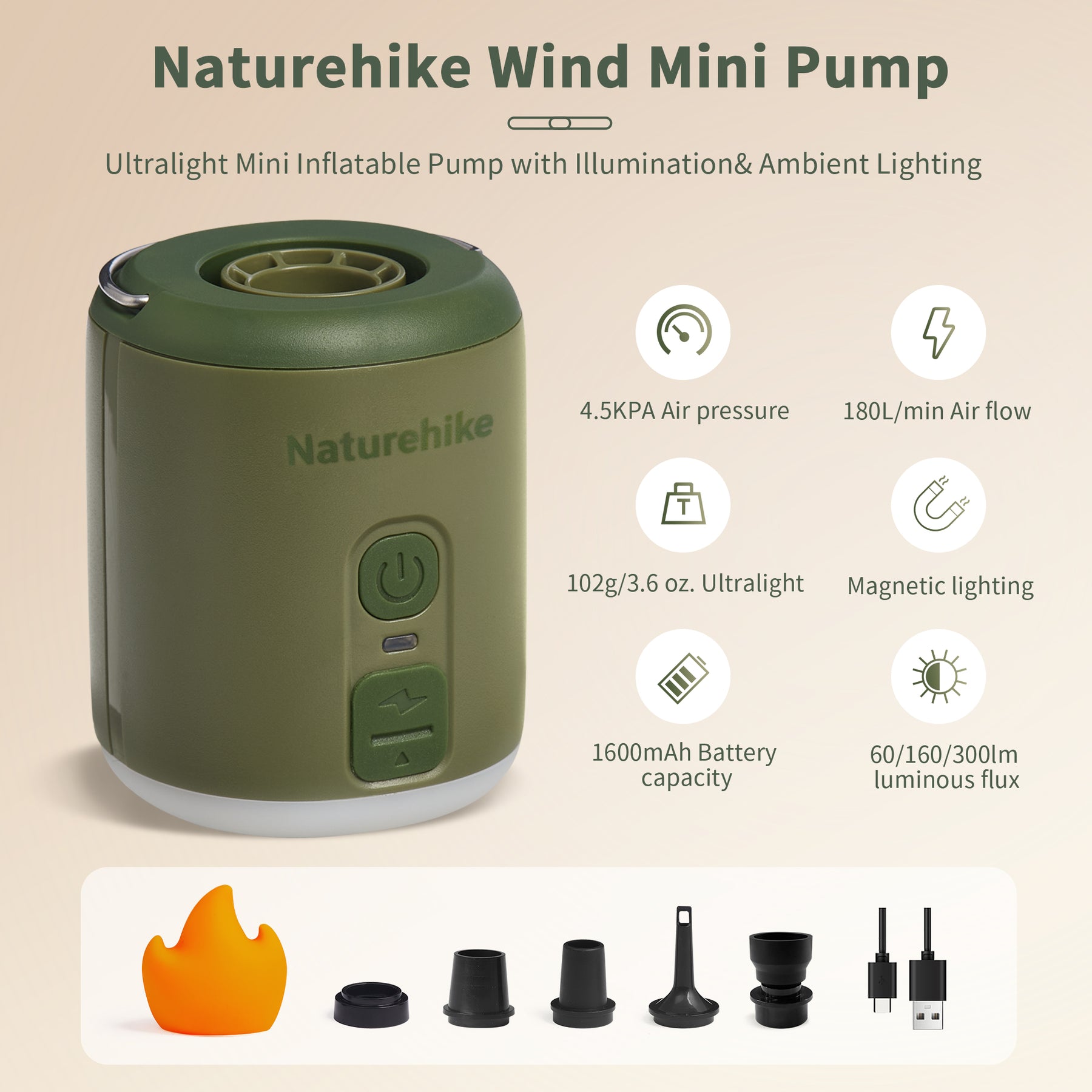 Naturehike Wind Mini Air Pump, Outdoor Multifunctional Tiny Pump (102g) with 1600mAh Battery, Lighting with Flame Lampshade, Efficient and Powerful Pump
