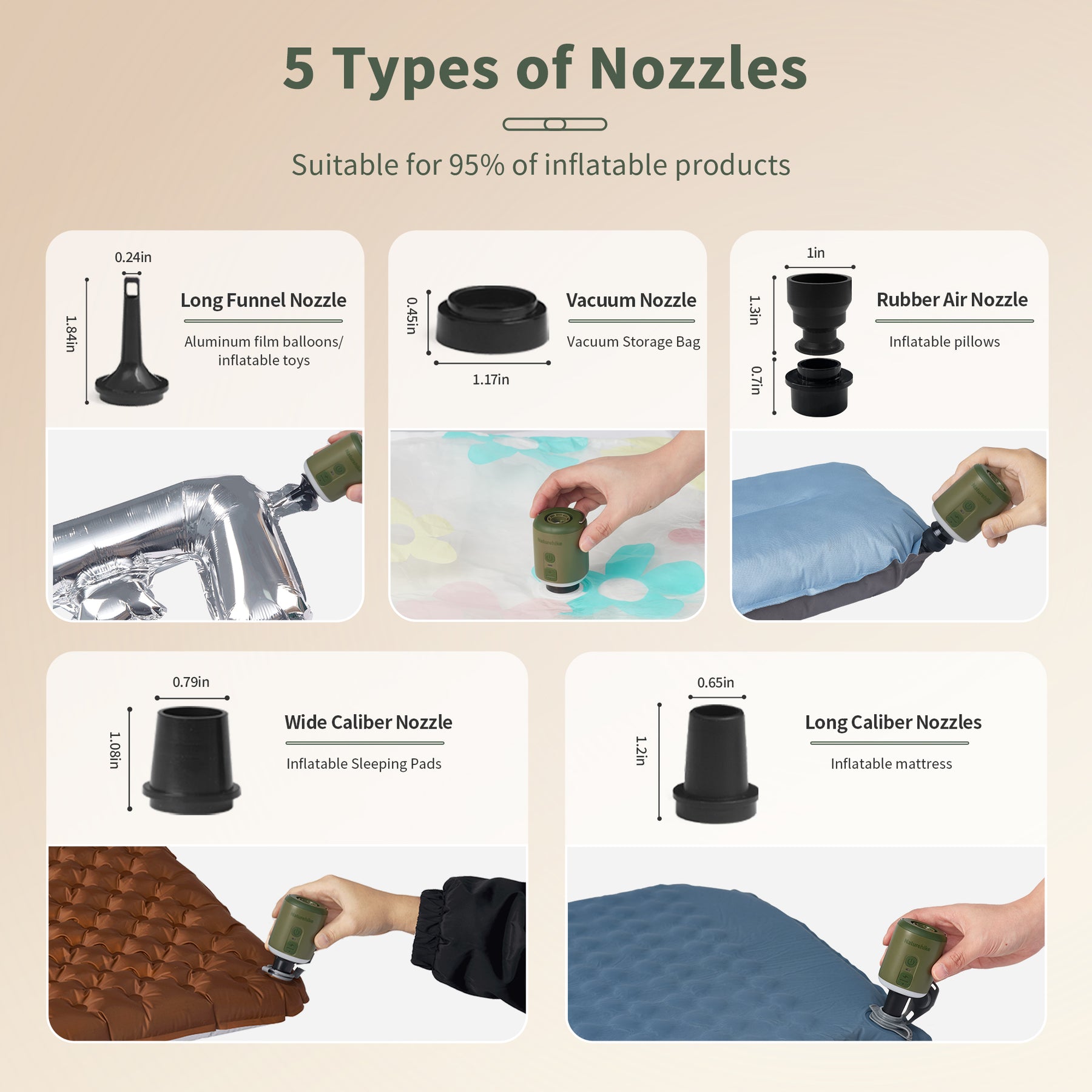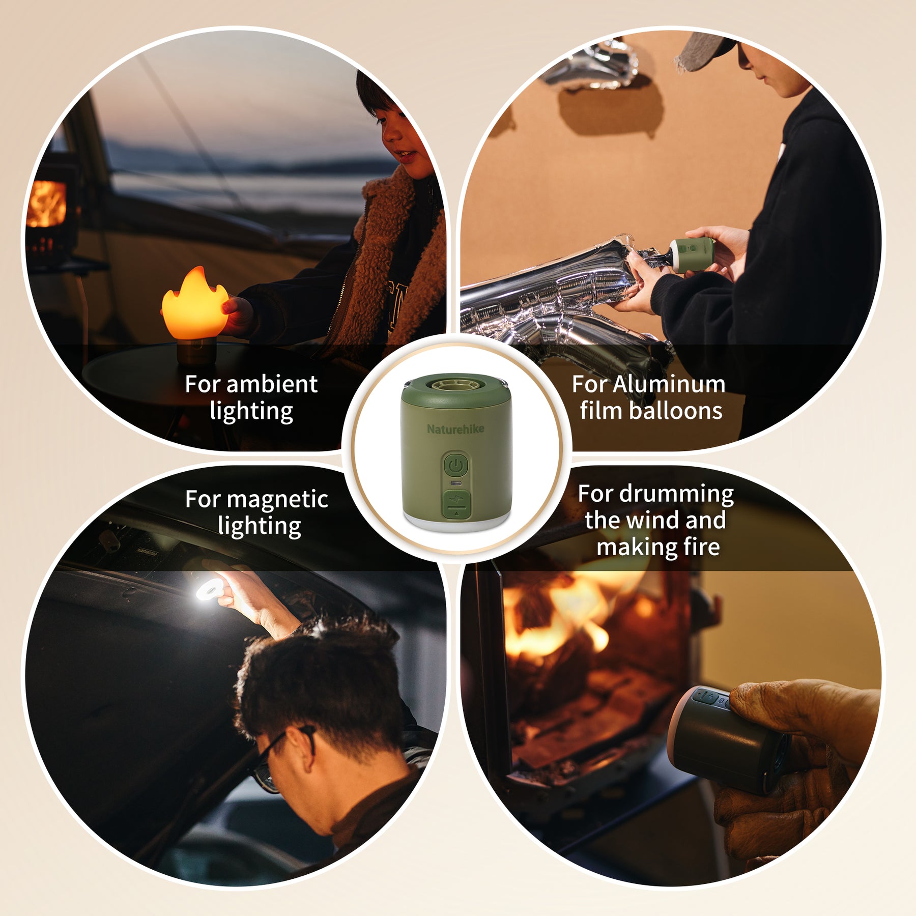 [Compact and Portable] Naturehike Wind Mini Air Pump only has the size of a bluetooth headset, which is φ5cm x 6cm. Come with its own hook and carry bag, so it is super easy to carry around. Package included: air pump x 1, air nozzles x 5, carry bag x 1, flame lampshade x 1.